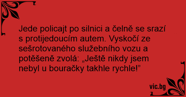 Jede policajt po silnici a čelně se srazí s protijedoucím autem. Vyskočí ze sešrotovaného služebního vozu a potěšeně zvolá: „Ještě nikdy jsem nebyl u bouračky takhle rychle!”