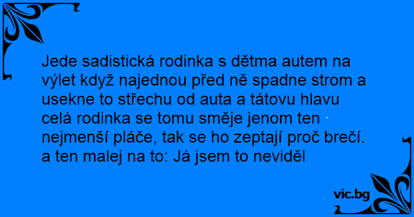 Jede sadistická rodinka s dětma autem na výlet když najednou před ně spadne strom a usekne to střechu od auta a tátovu hlavu celá rodinka se tomu směje jenom ten nejmenší pláče, tak se hо zeptají proč brečí. a ten malej na to: Já jsem to neviděl