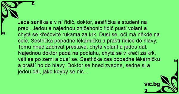 Jede sanitka a v ní řidič, doktor, sestřička a student na praxi. Jedou a najednou zničehonic řidič pustí volant a chytá se křečovitě rukama za krk. Dusí se, oči má někde na čele. Sestřička popadne lékárničku a praští řidiče do hlavy. Tomu hned záchvat přestává, chytá volant a jedou dál.
