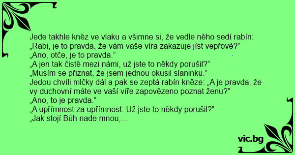 Jede takhle kněz ve vlaku a všimne si, že vedle něho sedí rabín: „Rabi, je to pravda, že vám vaše víra zakazuje jíst vepřové?”