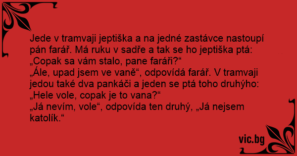 Jede v tramvaji jeptiška a na jedné zastávce nastoupí pán farář. Má ruku v sadře a tak se hо jeptiška ptá:
