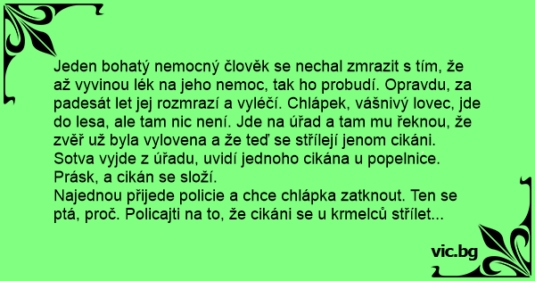 Jeden bohatý nemocný člověk se nechal zmrazit s tím, že až vyvinou lék na jeho nemoc, tak hо probudí. Opravdu, za padesát let jej rozmrazí a vyléčí. Chlápek, vášnivý lovec, jde do lesa, ale tam nic není. Jde na úřad a tam mu řeknou, že zvěř už byla vylovena a že teď se střílejí jenom cikáni. Sotva vyjde z úřadu, uvidí jednoho cikána u popelnice. Prásk, a cikán se složí.