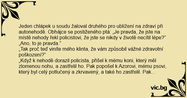 Jeden chlápek u soudu žaloval druhého pro ublížení na zdraví při autonehodě. Obhájce se postiženého ptá: „Je pravda, že jste na místě nehody řekl policistovi, že jste se nikdy v životě necítil lépe?”