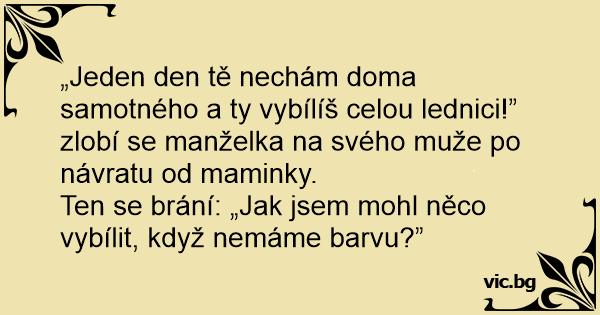 „Jeden den tě nechám doma samotného a ty vybílíš celou lednici!” zlobí se manželka na svého muže po návratu od maminky.