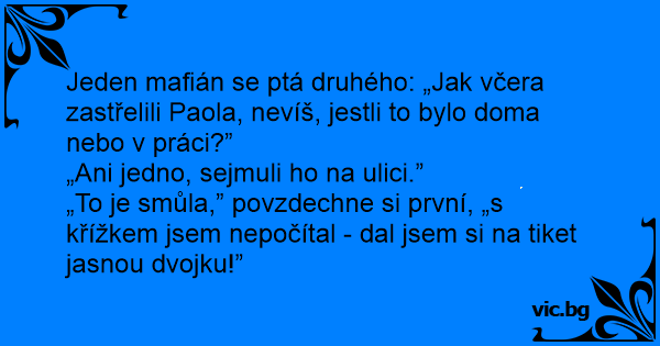 Jeden mafián se ptá druhého: „Jak včera zastřelili Paola, nevíš, jestli to bylo doma nebo v práci?”