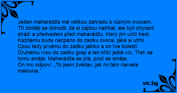 Jeden maharádža má velikou zahradu s různým ovocem. Tři zloději se dohodli, že si zajdou natrhat, ale byli chyceni stráží a předvedeni před maharádžu, který jim určil trest. Každému bude nacpáno do zadku ovoce, jaké si utrhl. Cpou tedy prvému do zadku jablko a on řve bolestí. Druhému rvou do zadku grep a ten křičí ještě víc. Třetí se tomu směje. Maharádža se ptá, proč se směje.
