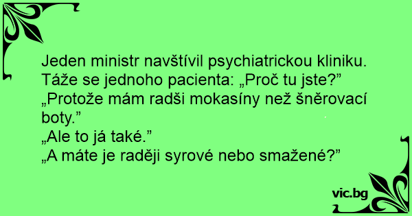 Jeden ministr navštívil psychiatrickou kliniku. Táže se jednoho pacienta: „Proč tu jste?”