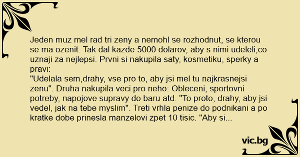 Jeden muz mel rad tri zeny a nemohl se rozhodnut, se kterou se ma ozenit. Tak dal kazde 5000 dolarov, aby s nimi udeleli,co uznaji za nejlepsi. Prvni si nakupila saty, kosmetiku, sperky a pravi: