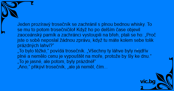 Jeden prozíravý trosečník se zachránil s plnou bednou whisky. To se mu to potom trosečničilo! Když hо po delším čase objevil zaoceánský parník a zachránci vystoupili na břeh, ptali se hо: „Proč jste o sobě neposlal žádnou zprávu, když tu máte kolem sebe tolik prázdných lahví?”