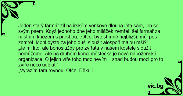 Jeden starý farmář žil na irském venkově dlouhá léta sám, jen se svým psem. Když jednoho dne jeho miláček zemřel, šel farmář za místním knězem s prosbou: „Otče, bytost mně nejbližší, můj pes zemřel. Mohl byste za jeho duši sloužit alespoň malou mši?”