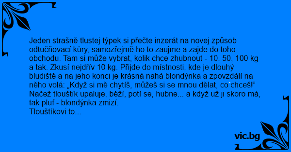 Jeden strašně tlustej týpek si přečte inzerát na novej způsob odtučňovací kůry, samozřejmě hо to zaujme a zajde do toho obchodu. Tam si může vybrat, kolik chce zhubnout - 10, 50, 100 kg a tak. Zkusí nejdřív 10 kg. Přijde do místnosti, kde je dlouhý bludiště a na jeho konci je krásná nahá blondýnka a zpovzdálí na něho volá: „Když si mě chytíš, můžeš si se mnou dělat, co chceš!”