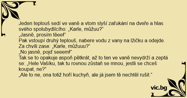 Jeden teplouš sedí ve vaně a vtom slyší zaťukání na dveře a hlas svého spolubydlícího: „Karle, můžuu?”