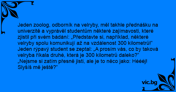 Jeden zoolog, odborník na velryby, měl takhle přednášku na univerzitě a vyprávěl studentům některé zajímavosti, které zjistil při svém bádání: „Představte si, například, některé velryby spolu komunikují až na vzdálenost 300 kilometrů!”