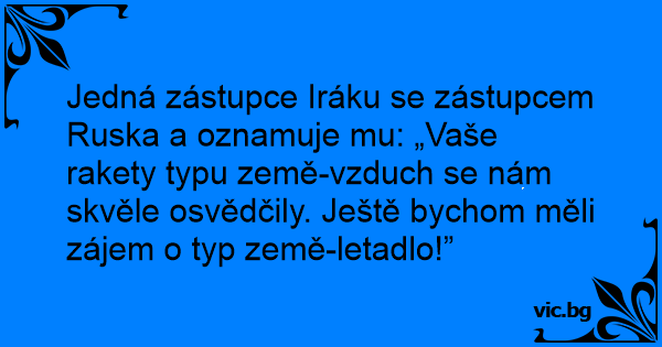 Jedná zástupce Iráku se zástupcem Ruska a oznamuje mu: „Vaše rakety typu země-vzduch se nám skvěle osvědčily. Ještě bychom měli zájem o typ země-letadlo!”