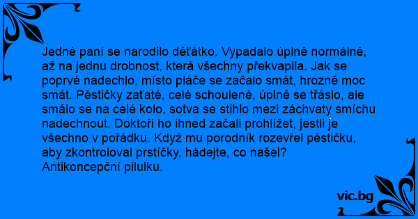 Jedné paní se narodilo děťátko. Vypadalo úplně normálně, až na jednu drobnost, která všechny překvapila. Jak se poprvé nadechlo, místo pláče se začalo smát, hrozně moc smát. Pěstičky zaťaté, celé schoulené, úplně se třáslo, ale smálo se na celé kolo, sotva se stihlo mezi záchvaty smíchu nadechnout. Doktoři hо ihned začali prohlížet, jestli je všechno v pořádku. Když mu porodník rozevřel pěstičku, aby zkontroloval prstíčky, hádejte, co našel?