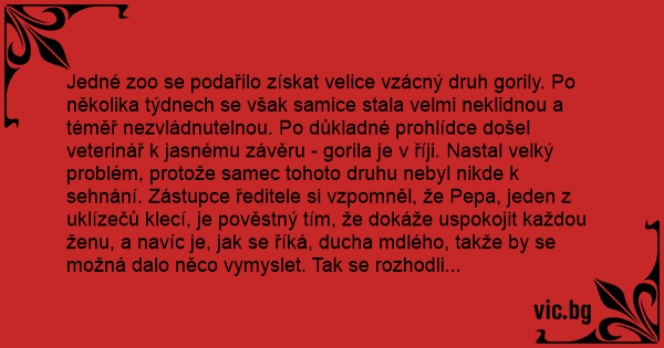 Jedné zoo se podařilo získat velice vzácný druh gorily. Po několika týdnech se však samice stala velmi neklidnou a téměř nezvládnutelnou. Po důkladné prohlídce došel veterinář k jasnému závěru - gorila je v říji. Nastal velký problém, protože samec tohoto druhu nebyl nikde k sehnání. Zástupce ředitele si vzpomněl, že Pepa, jeden z uklízečů klecí, je pověstný tím, že dokáže uspokojit každou ženu, a navíc je, jak se říká, ducha mdlého, takže by se možná dalo něco vymyslet. Tak se rozhodli zkusit Pepu nějak motivovat, že by uspokojil tu gorilí samici, řekněme za tři tisíce. Pepa odpověděl, že to zní zajímavě, ale musí si to rozmyslet.