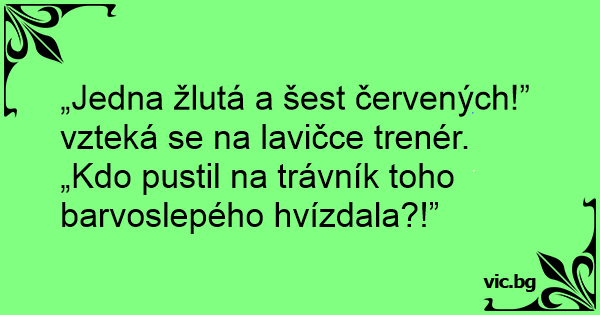 „Jedna žlutá a šest červených!” vzteká se na lavičce trenér. „Kdo pustil na trávník toho barvoslepého hvízdala?!”