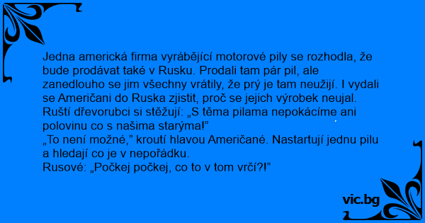 Jedna americká firma vyrábějící motorové pily se rozhodla, že bude prodávat také v Rusku. Prodali tam pár pil, ale zanedlouho se jim všechny vrátily, že prý je tam neužijí. I vydali se Američani do Ruska zjistit, proč se jejich výrobek neujal.