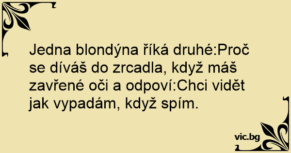 Jedna blondýna říká druhé:Proč se díváš do zrcadla, když máš zavřené oči a odpoví:Chci vidět jak vypadám, když spím.