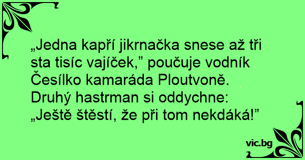 „Jedna kapří jikrnačka snese až tři sta tisíc vajíček,” poučuje vodník Česílko kamaráda Ploutvoně.