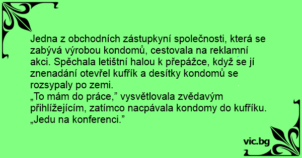 Jedna z obchodních zástupkyní společnosti, která se zabývá výrobou kondomů, cestovala na reklamní akci. Spěchala letištní halou k přepážce, když se jí znenadání otevřel kufřík a desítky kondomů se rozsypaly po zemi.