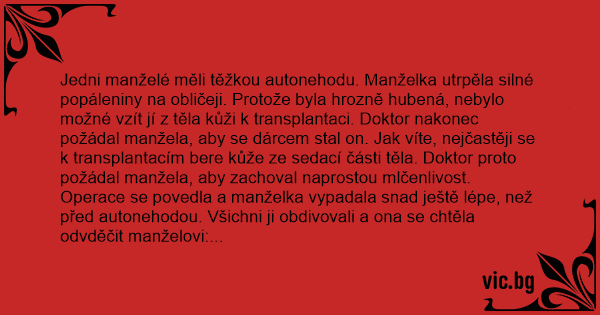 Jedni manželé měli těžkou autonehodu. Manželka utrpěla silné popáleniny na obličeji. Protože byla hrozně hubená, nebylo možné vzít jí z těla kůži k transplantaci. Doktor nakonec požádal manžela, aby se dárcem stal on. Jak víte, nejčastěji se k transplantacím bere kůže ze sedací části těla. Doktor proto požádal manžela, aby zachoval naprostou mlčenlivost.
