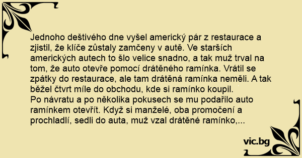 Po návratu a po několika pokusech se mu podařilo auto ramínkem otevřít. Když si manželé, oba promočení a prochladlí, sedli do auta, muž vzal drátěné ramínko, dal si hо pod sedadlo a s lišáckým úsměvem prohlásil: „Tak, a když se nám to stane znovu, už hо nebudeme muset shánět!”