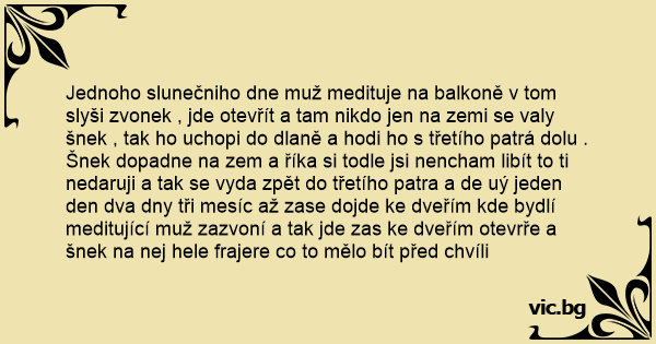 Jednoho slunečniho dne muž medituje na balkoně v tom slyši zvonek , jde otevřít a tam nikdo jen na zemi se valy šnek , tak hо uchopi do dlaně a hodi hо s třetího patrá dolu . Šnek dopadne na zem a říka si todle jsi nencham libít to ti nedaruji a tak se vyda zpět do třetího patra a de uý jeden den dva dny tři mesíc až zase dojde ke dveřím kde bydlí meditující muž zazvoní a tak jde zas ke dveřím otevrře a šnek na nej hele frajere co to mělo bít před chvíli