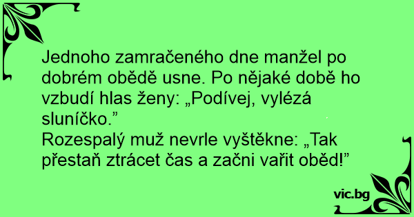 Rozespalý muž nevrle vyštěkne: „Tak přestaň ztrácet čas a začni vařit oběd!”