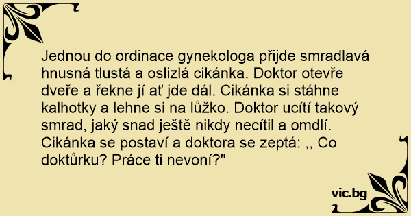 Jednou do ordinace gynekologa přijde smradlavá hnusná tlustá a oslizlá cikánka. Doktor otevře dveře a řekne jí ať jde dál. Cikánka si stáhne kalhotky a lehne si na lůžko. Doktor ucítí takový smrad, jaký snad ještě nikdy necítil a omdlí. Cikánka se postaví a doktora se zeptá: ,, Co doktůrku? Práce ti nevoní?"