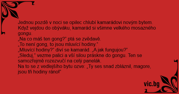 Na to se z vedlejšího bytu ozve: „Ty ses snad zbláznil, magore, jsou tři hodiny ráno!”