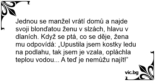 Jednou se manžel vrátí domů a najde svoji blonďatou ženu v slzách, hlavu v dlaních. Když se ptá, co se děje, žena mu odpovídá: „Upustila jsem kostky ledu na podlahu, tak jsem je vzala, opláchla teplou vodou... A teď je nemůžu najít!”