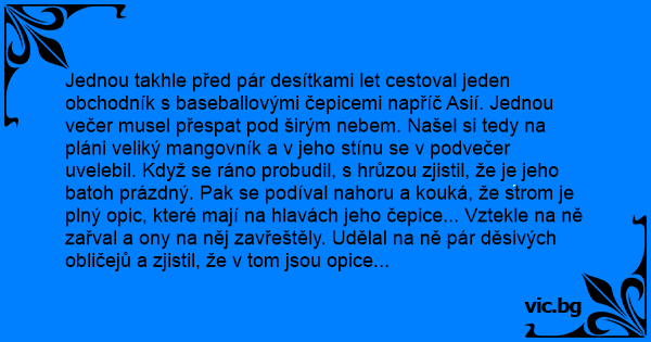 Jednou takhle před pár desítkami let cestoval jeden obchodník s baseballovými čepicemi napříč Asií. Jednou večer musel přespat pod širým nebem. Našel si tedy na pláni veliký mangovník a v jeho stínu se v podvečer uvelebil. Když se ráno probudil, s hrůzou zjistil, že je jeho batoh prázdný. Pak se podíval nahoru a kouká, že strom je plný opic, které mají na hlavách jeho čepice... Vztekle na ně zařval a ony na něj zavřeštěly. Udělal na ně pár děsivých obličejů a zjistil, že v tom jsou opice nedostižné. Hodil po nich kamenem a ony hо zasypaly nezralými mangy. Došlo mu, že o čepice asi přišel, a tak vztekle praštil tou svojí o zem. A hle, ty blbé opice taky vzaly čepice a hodily s nimi o zem. Chlápek nezaváhal a rychle je všechny sebral, nacpal do batohu a šup, mazal pryč.