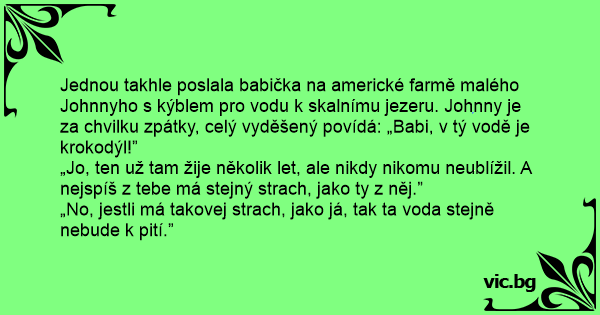 Jednou takhle poslala babička na americké farmě malého Johnnyho s kýblem pro vodu k skalnímu jezeru. Johnny je za chvilku zpátky, celý vyděšený povídá: „Babi, v tý vodě je krokodýl!”