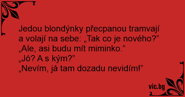 Jedou blondýnky přecpanou tramvají a volají na sebe: „Tak co je nového?”