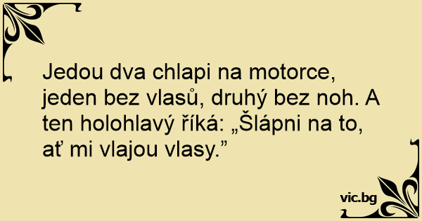 Jedou dva chlapi na motorce, jeden bez vlasů, druhý bez noh. A ten holohlavý říká: „Šlápni na to, ať mi vlajou vlasy.”
