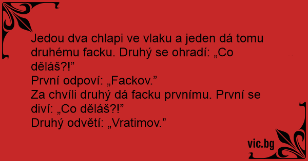 Jedou dva chlapi ve vlaku a jeden dá tomu druhému facku. Druhý se ohradí: „Co děláš?!”