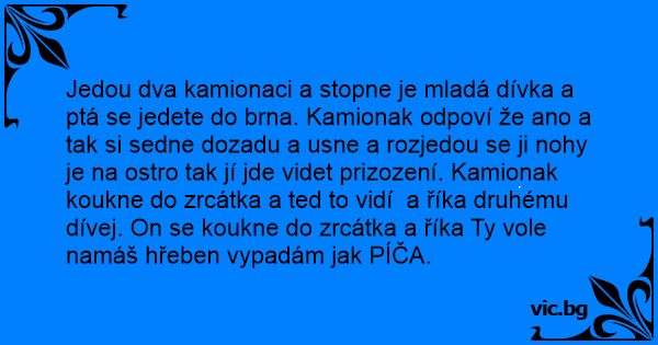 Jedou dva kamionaci a stopne je mladá dívka a ptá se jedete do brna. Kamionak odpoví že ano a tak si sedne dozadu a usne a rozjedou se ji nohy je na ostro tak jí jde videt prizození. Kamionak koukne do zrcátka a ted to vidí a říka druhému dívej. On se koukne do zrcátka a říka Ty vole namáš hřeben vypadám jak PÍČA.