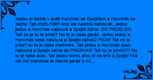 Jedou si takhle v autě Hurvínek se Spejblem a Hurvínek se zeptá: Tati můžu řídit? Ano ale nesmíš nabourat. Jedou jedou a Hurvínek nabourá a Spejbl žařve: DO PRDELE!!! Tati co je to ta prdel? No to je naše garáž. Jedou jedou a Hurvínek zase nabourá a Spejbl zařveO PÍČI!!! Tati co je píča? no to je naše maminka. Tak jedou a Hurvínek zase nabourá a Spejbl zařve do PINDÍKA!!! Tati co je pindík?? No to je naše auto. Tak jedou domů atou je na šrot a Spejbl říká Jdi říct mamince at otevře garáž a mi tam zajedem s autem. Hurvínek příjde za maminkou a říká:Otevři tu prdel píčo my tam zajedem s pindíkem.