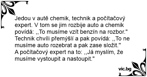 Jedou v autě chemik, technik a počítačový expert. V tom se jim rozbije auto a chemik povídá: ,,To musíme vzít benzín na rozbor."