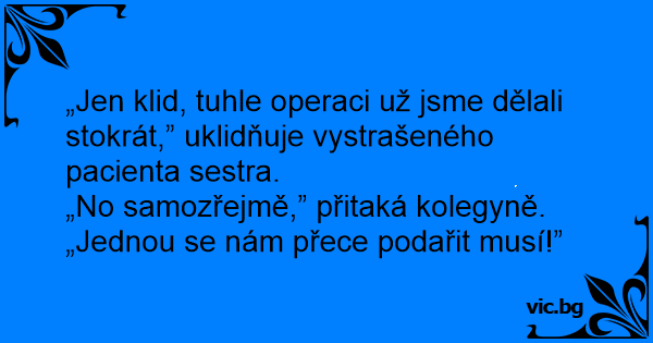 „Jen klid, tuhle operaci už jsme dělali stokrát,” uklidňuje vystrašeného pacienta sestra.