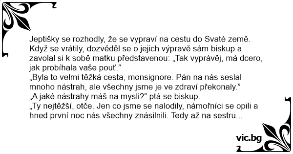 Jeptišky se rozhodly, že se vypraví na cestu do Svaté země. Když se vrátily, dozvěděl se o jejich výpravě sám biskup a zavolal si k sobě matku představenou: „Tak vyprávěj, má dcero, jak probíhala vaše pouť.”