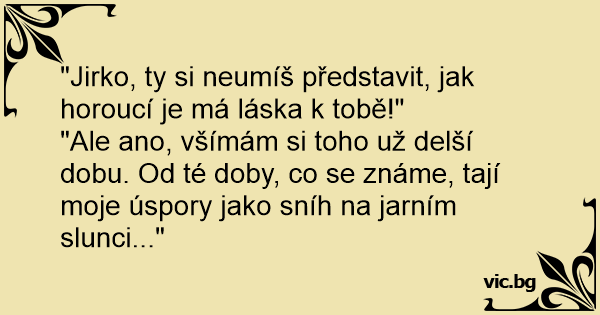 "Jirko, ty si neumíš představit, jak horoucí je má láska k tobě!"