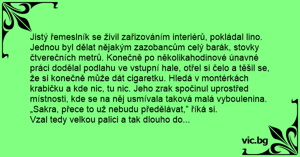 Jistý řemeslník se živil zařizováním interiérů, pokládal lino. Jednou byl dělat nějakým zazobancům celý barák, stovky čtverečních metrů. Konečně po několikahodinové únavné práci dodělal podlahu ve vstupní hale, otřel si čelo a těšil se, že si konečně může dát cigaretku. Hledá v montérkách krabičku a kde nic, tu nic. Jeho zrak spočinul uprostřed místnosti, kde se na něj usmívala taková malá vyboulenina.