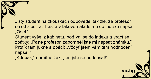 Student vyšel z kabinetu, podíval se do indexu a vrací se zpátky: „Pane profesor, zapomněl jste mi napsat známku.”