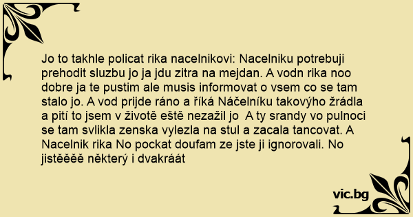 Jo to takhle policat rika nacelnikovi: Nacelniku potrebuji prehodit sluzbu jo ja jdu zitra na mejdan. A vodn rika noo dobre ja te pustim ale musis informovat o vsem co se tam stalo jo. A vod prijde ráno a říká Náčelníku takovýho žrádla a pití to jsem v životě eště nezažil jo A ty srandy vo pulnoci se tam svlikla zenska vylezla na stul a zacala tancovat. A Nacelnik rika No pockat doufam ze jste ji ignorovali. No jistěěěě některý i dvakráát