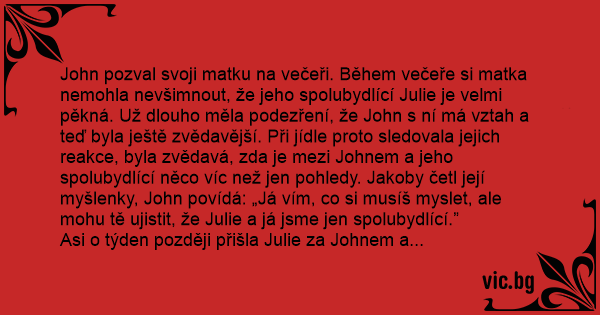 John pozval svoji matku na večeři. Během večeře si matka nemohla nevšimnout, že jeho spolubydlící Julie je velmi pěkná. Už dlouho měla podezření, že John s ní má vztah a teď byla ještě zvědavější. Při jídle proto sledovala jejich reakce, byla zvědavá, zda je mezi Johnem a jeho spolubydlící něco víc než jen pohledy. Jakoby četl její myšlenky, John povídá: „Já vím, co si musíš myslet, ale mohu tě ujistit, že Julie a já jsme jen spolubydlící.”