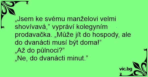 „Jsem ke svému manželovi velmi shovívavá,” vypráví kolegyním prodavačka. „Může jít do hospody, ale do dvanácti musí být doma!”