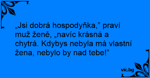 „Jsi dobrá hospodyňka,” praví muž ženě, „navíc krásná a chytrá. Kdybys nebyla má vlastní žena, nebylo by nаd tebe!”