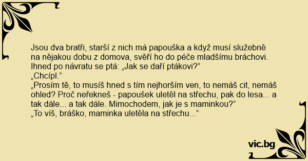 Jsou dva bratři, starší z nich má papouška a když musí služebně na nějakou dobu z domova, svěří hо do péče mladšímu bráchovi. Ihned po návratu se ptá: „Jak se daří ptákovi?”